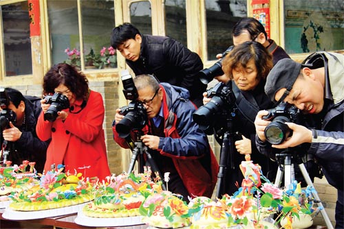 近日,中國(guó)民俗網(wǎng)、中國(guó)旅游網(wǎng)攝影記者和業(yè)余攝影愛(ài)好者30余人聚集在原平市衛(wèi)村面塑藝人趙佩云家中,全程拍攝山西非物質(zhì)文化遺產(chǎn)面塑食品的制作過(guò)程。面塑是山西民間喜聞樂(lè)見的一種食品,原平市衛(wèi)村面塑藝人趙佩云融合了歷史文化和民間藝術(shù),制作的面塑做工考究,形式多樣,色澤艷麗,受到了人們的追捧,吸引了眾多記者的鏡頭。(吉建平 攝)