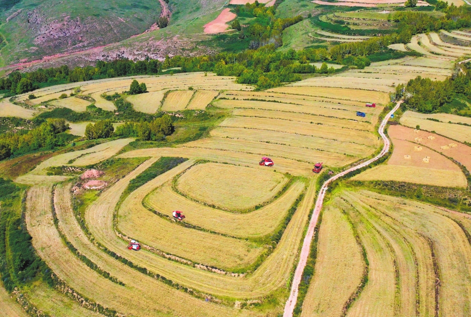 寧武縣頭馬營村萬畝莜麥種植基地機械化收割場景。吳光宇攝