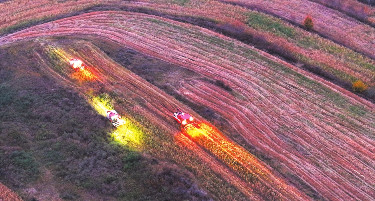 河曲縣劉家塔鎮(zhèn)千畝谷子基地搭載北斗導航系統(tǒng)收割機正在作業(yè)。何帥攝
