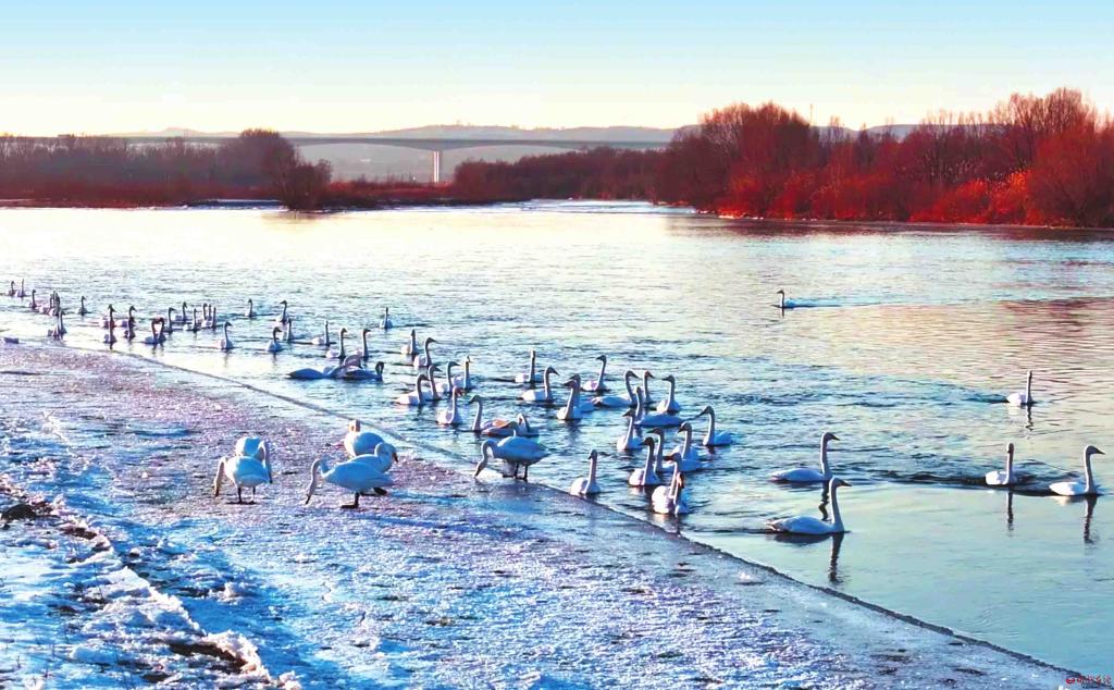 寒冬時(shí)節(jié),黃河河曲段迎來最動人的風(fēng)景——湛藍(lán)的河面上,潔白的大天鵝如約而至,或翩躚起舞、或振翅嬉戲,為冬日的黃河增添了一抹生機(jī)與亮色。(苗吉 攝)