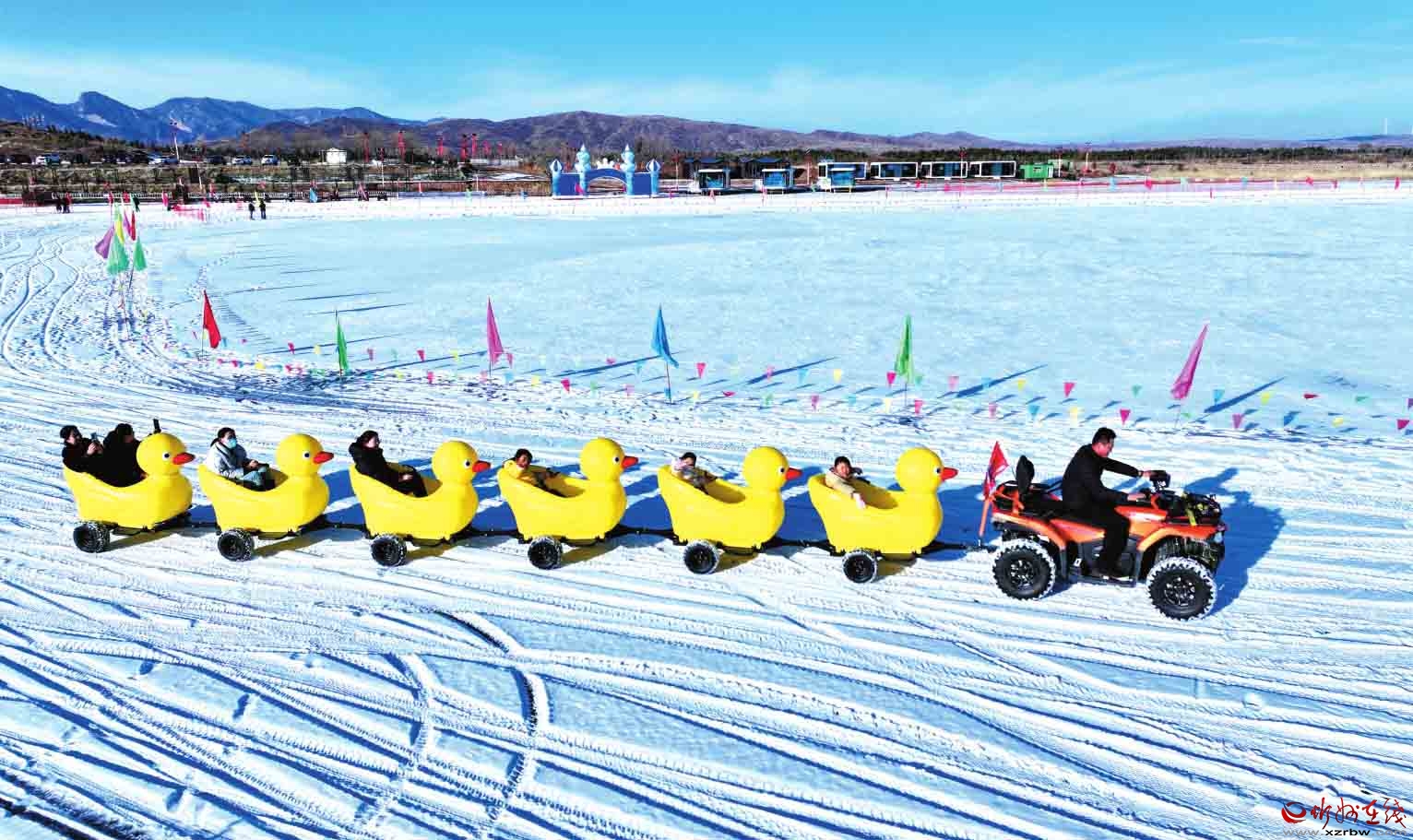 近日,寧武縣鴨子海冰雪大世界內(nèi)紅火熱鬧,一片歡樂景象。圖為冰面上,游客們盡情享受著冰雪項目帶來的樂趣。(