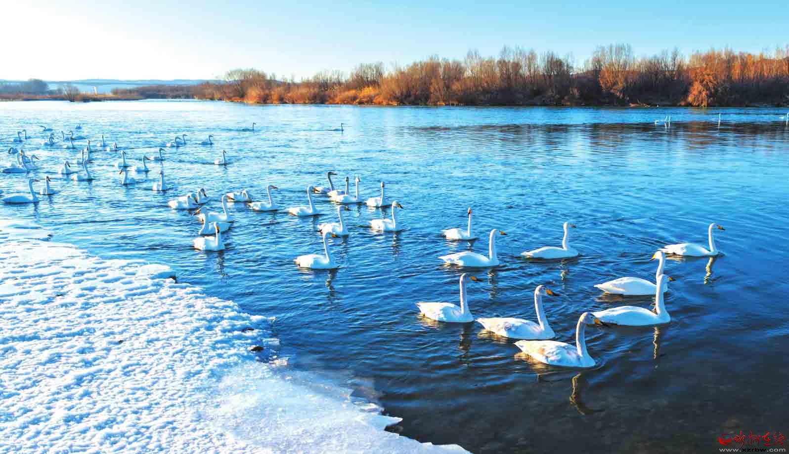 春節(jié)期間,黃河河曲段迎來了大規(guī)模越冬白天鵝,潔白的天鵝在黃河水域中游弋、嬉戲,勾勒出一幅自然生態(tài)和諧的美麗畫卷。(記者 張存良攝)