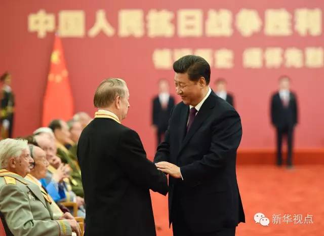 2015年9月2日,習(xí)近平在北京人民大會(huì)堂向30名抗戰(zhàn)老戰(zhàn)士老同志、抗戰(zhàn)將領(lǐng)、幫助和支持中國(guó)抗戰(zhàn)的國(guó)際友人或其遺屬代表頒發(fā)中國(guó)人民抗日戰(zhàn)爭(zhēng)勝利70周年紀(jì)念章并發(fā)表重要講話。新華社記者 謝環(huán)馳攝