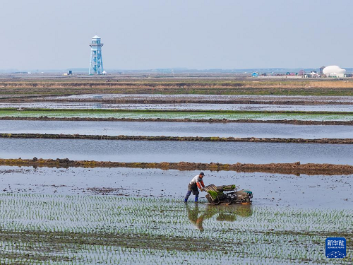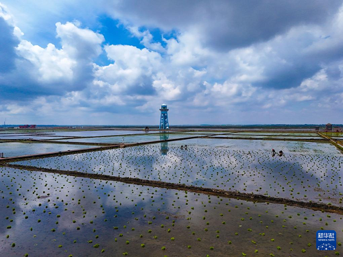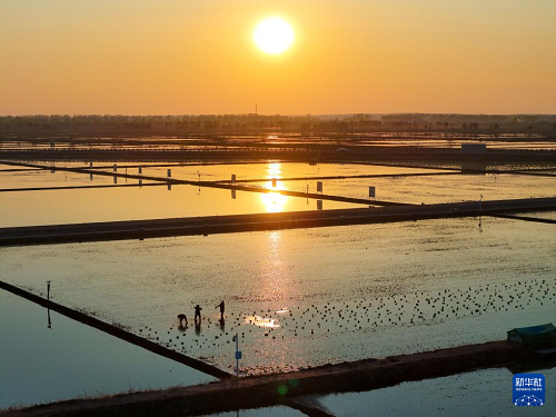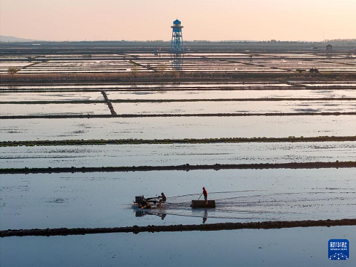 在黑龍江省佳木斯市富錦市的萬畝水稻公園,一塊塊稻田宛若“天空之鏡”,勞動(dòng)者在“鏡”中插秧作業(yè),與藍(lán)天白云、夕陽霞光構(gòu)成壯美的農(nóng)耕圖景。