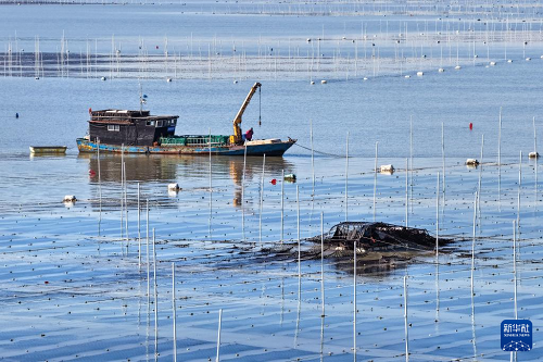 1月8日,漁民在江蘇連云港市海州灣漁場養(yǎng)殖區(qū)收獲條斑紫菜(無人機(jī)照片)。(新華社發(fā) 王健民 攝)