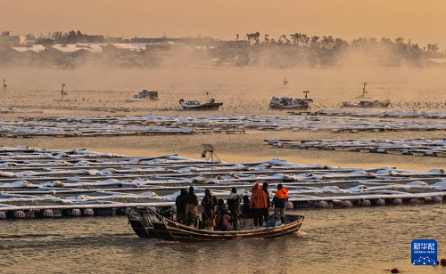 1月12日,雪后的山東省榮成市愛倫灣海洋牧場出現(xiàn)“海浩”景觀。據(jù)悉,“海浩”景觀是一種在嚴(yán)寒天氣下出現(xiàn)的自然奇觀,表現(xiàn)為海面或湖面上水汽蒸發(fā)后遇冷凝結(jié),形成白茫茫的霧氣,如同水面沸騰一般。