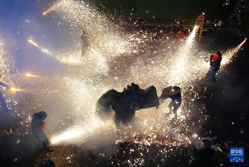 3月2日,在陜西旬陽市蜀河鎮(zhèn)蜀河社區(qū),表演人員在用煙花“燒獅子”。(新華社記者 邵瑞 攝)