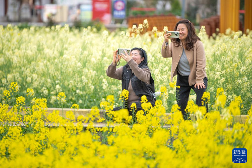 3月9日,游客在油菜花田拍照。(新華社記者 唐奕 攝)