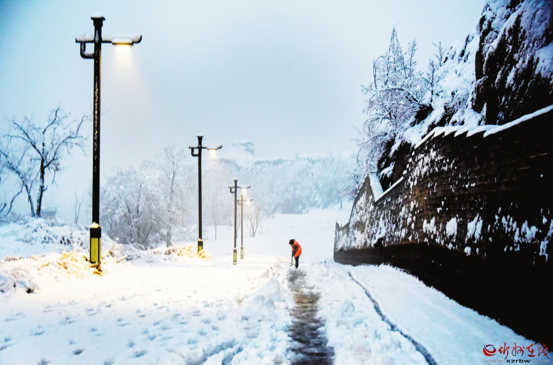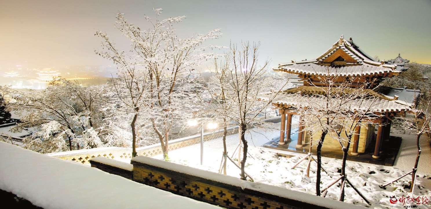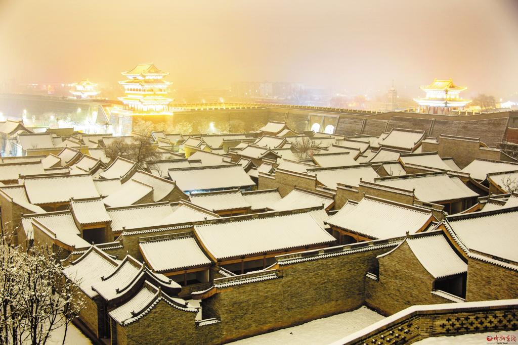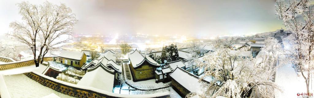 3月19日,我市普降瑞雪,雪后的忻州古城銀裝素裹,古建民居和燈火璀璨的夜景相互輝映,宛如畫(huà)卷。(趙晨善 攝)