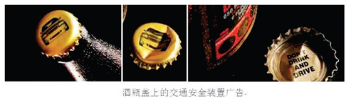 美國將警示語作為酒品包裝的強制性標(biāo)注內(nèi)容,要求飲料,酒的品牌標(biāo)簽、獨立的前標(biāo)簽或者背標(biāo)簽、側(cè)標(biāo)簽都應(yīng)獨立,并有別于標(biāo)簽中其他信息地標(biāo)示:“政府警示,根據(jù)普通外科醫(yī)生建議,孕婦不應(yīng)該飲酒,以防止新生兒缺陷,飲酒會減弱個人駕駛車或操控機械的能力并可能引發(fā)健康問題?!贝送?國外的產(chǎn)品包裝設(shè)計上也植入了公益理念。如上圖廣告可對飲酒人群針對性的進(jìn)行廣告宣傳,采用打開酒瓶蓋必須以破壞“車輛”為代價的形式,傳達(dá)喝酒不能開車的安全理念。