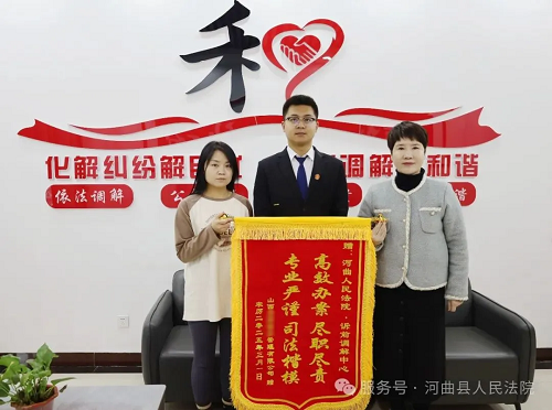 “感謝調(diào)解員為我們排憂解難,提供高效便捷的司法服務(wù),本來以為訴訟時間會很長,沒想到這么快就處理好了,今后我們一定努力提高服務(wù)水平?!苯?,某物業(yè)公司將一面寫有“高效辦案盡職盡責(zé) 專業(yè)嚴(yán)謹(jǐn)司法楷?!钡腻\旗送至河曲法院訴前調(diào)解中心,對法院溫馨的訴訟服務(wù)和特邀調(diào)解員優(yōu)質(zhì)高效的調(diào)解表示感謝!