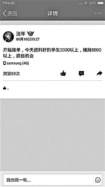 林曉借的錢越來越多,30%的利息下,很快500、1000的小額貸款就滿足不了林曉拆東墻補(bǔ)西墻的需求了?!斑@時(shí)候就看到群里有中介說,女大學(xué)生可以‘裸持’借款,即使有‘負(fù)債’也沒關(guān)系,發(fā)送裸照給老板就能借到更多錢。”