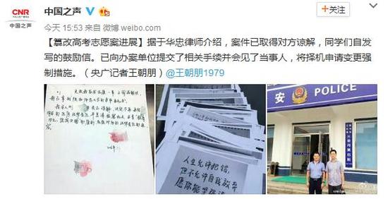 備受關(guān)注的山東青島膠州高三畢業(yè)生常升高考志愿被 同學(xué)郭某某篡改一事有最新進(jìn)展。案件已取得對(duì)方諒解,同學(xué)們自發(fā)寫鼓勵(lì)信。已向辦案單位提交了相關(guān)手續(xù)并會(huì)見了當(dāng)事人,將擇機(jī)申請(qǐng)變更強(qiáng)制措施。(來源:中國(guó)之聲)