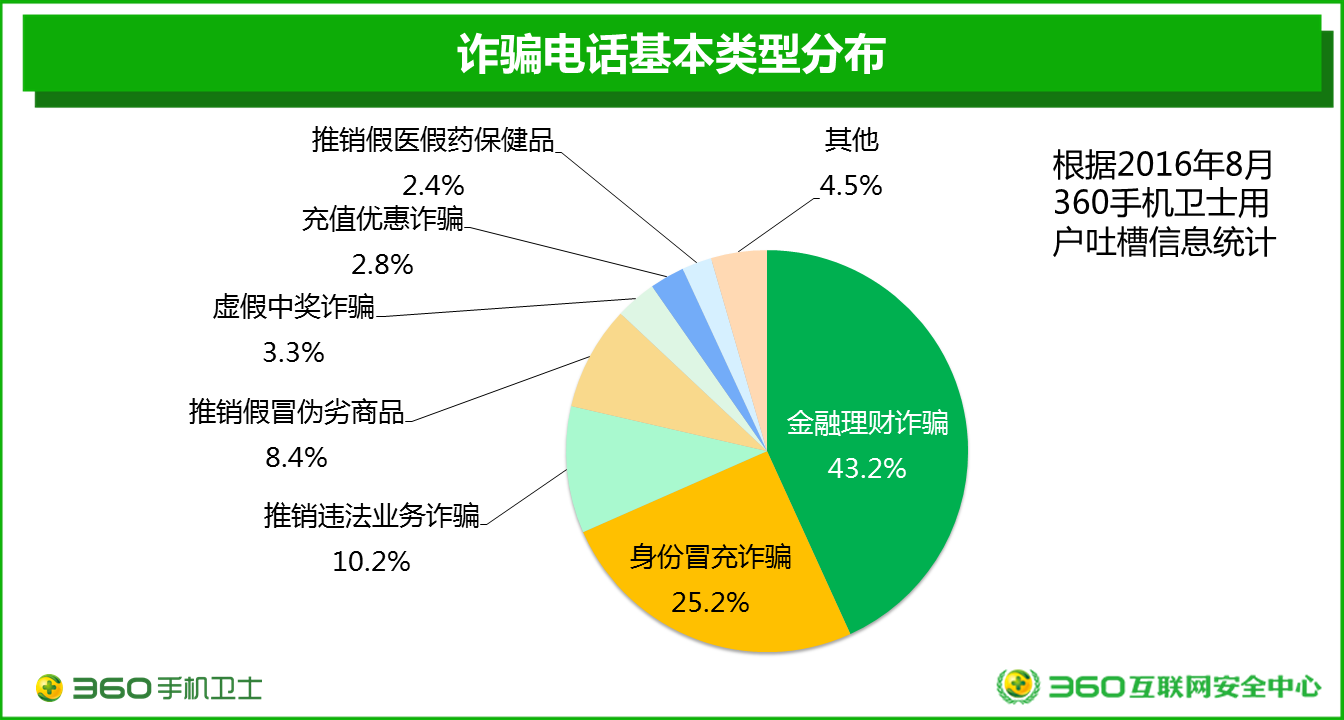 9月7日,360在京發(fā)布了國內(nèi)首份基于大數(shù)據(jù)研究的電信詐騙分析報(bào)告——《2016中國電信詐騙形勢(shì)分析報(bào)告》。報(bào)告中顯示,在用戶接到的所有詐騙電話中,虛假的金融理財(cái)詐騙最多,占43.2%,此類詐騙在北上廣深等大城市尤其盛行。其次是身份冒充詐騙,占25.2%。各類虛假的業(yè)務(wù)推銷電話也是被用戶大量吐槽的詐騙電話類型。
