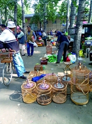 昨天上午,記者來(lái)到北沙灘橋附近,看到臨時(shí)集市藏身于一片楊樹林里,并被高高的圍墻圍了起來(lái)。樹林里賣鴿子的、賣小鳥的、賣魚的、賣蟲的、賣古玩的攤子應(yīng)有盡有。其中,售賣小鳥的攤子有五六個(gè),有的把鳥籠直接掛在樹上,有的則在地上鋪開來(lái),幾十只鳥籠排成一排(如圖)。據(jù)了解,有護(hù)鳥志愿者在上周末拍到的圖片中,幾百只鳥兒被關(guān)在籠里售賣。