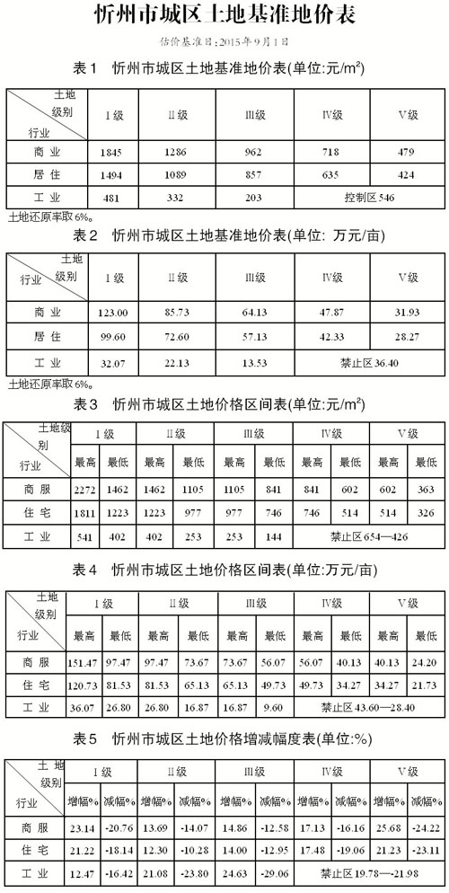 忻州市新一輪城鎮(zhèn)土地面積134.99平方公里基準地價更新工作已經省國土資源廳組織有關專家檢查驗收。根據《山西省國土資源廳關于忻州市城鎮(zhèn)土地定級估價更新結果的批復》(晉國土資技審〔2015〕118號),現將忻州市城鎮(zhèn)土地基準地價予以公布實施。