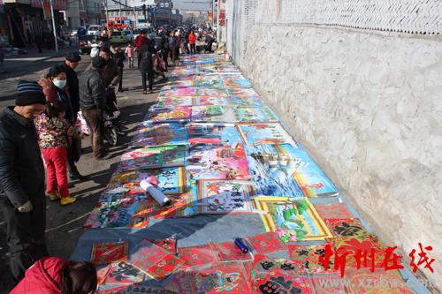 2月1日,在原平市新原鄉(xiāng)解放街村的農(nóng)貿(mào)市場上,村民們正在選購年畫。過年了,不少農(nóng)村都在集市上選購年畫、春聯(lián)、窗花、燈籠、掛件,準備過個祥和喜慶的猴年春節(jié)。(曹申義 攝)