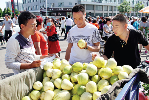 5 月29 日,原平市王家莊鄉(xiāng)弓家莊村的農(nóng)民正在農(nóng)貿(mào)市場銷售大棚香瓜、蔬菜。近年來,該市加大財(cái)政扶持力度,加快產(chǎn)業(yè)結(jié)構(gòu)調(diào)整,大力發(fā)展蔬菜大棚。目前,該村戶均1座大棚,人均產(chǎn)值1.5 萬元。(褚震 攝)