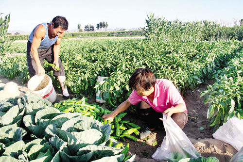 7月13日,原平市新原鄉(xiāng)解放街村農(nóng)民將收獲的青椒銷往市場(chǎng)。該市積極引導(dǎo)城郊農(nóng)民利用地理優(yōu)勢(shì),大力調(diào)整種植結(jié)構(gòu),加大特色農(nóng)業(yè)開(kāi)發(fā)力度,因地制宜種植紫甘藍(lán)、青椒等新鮮無(wú)公害蔬菜,不僅豐富了市民的菜籃子,而且鼓起了菜農(nóng)的錢袋子。(褚震 攝)