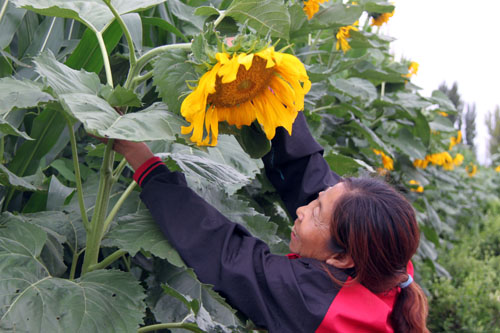 7月20日,原平市解放街農(nóng)民劉麗平正在長勢喜人葵花地里打支扣進(jìn)行管理。該市積極引導(dǎo)農(nóng)民大力發(fā)展油料經(jīng)濟農(nóng)業(yè)種植,因地制宜、多措并舉,促使農(nóng)業(yè)增產(chǎn)農(nóng)民增收。(趙春曉 攝)