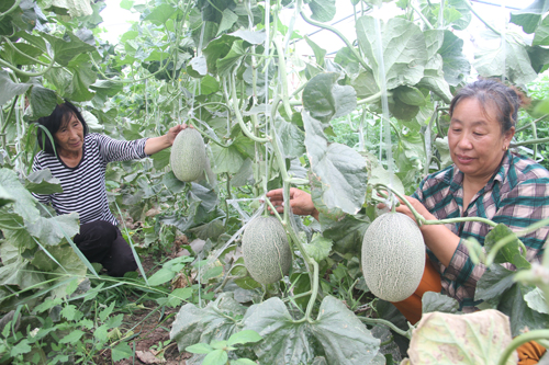 7月28日,原平市雙惠現(xiàn)代農業(yè)示范園區(qū)的哈密瓜種植基地,鋼架溫室大棚里,藤蔓在架子上攀援,繁茂的枝葉間,一個個圓滾滾的小哈密瓜已經(jīng)探出了腦袋。近年來,該園區(qū)積極探索農民工多元增收途徑,調整農業(yè)種植結構。這次引進新疆哈密瓜種植取得成功,為我市發(fā)展高效農業(yè)起到了示范作用。圖為工作人員正在查看哈密瓜長勢,預計八月初可收摘上市。(褚震 攝)