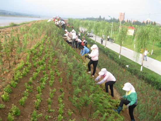 8月24日,河曲縣城北防護堤上植綠場面熱火朝天:數(shù)十名工人在堤上成排栽植爬地柏,坡面栽成菱形邊;菱形內外栽植花草“三七景天”;園林綠化車輛跟進澆水。