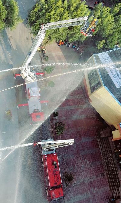 9月26日,在忻州師范學(xué)院內(nèi),當(dāng)?shù)叵啦块T(mén)舉行了國(guó)慶節(jié)前應(yīng)急疏散演練,其中包括滅火器材使用、火場(chǎng)逃生自救等演練項(xiàng)目。(樊晶璟 攝)