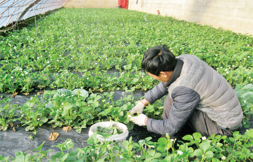 河曲縣農(nóng)民孫寶元利用日光大棚技術(shù)開展冬季草莓種植,3座日光大棚安排種植了早、中、晚熟三個品種。早熟品種將在新年開園,光是頭茬就預(yù)計能賣1萬元,草莓種植帶他駛?cè)肓酥赂坏目燔嚨馈?span style="font-family: 楷體,楷體_gb2312, simkai">圖為孫寶元正在大棚修剪草莓。(賈金理 攝)