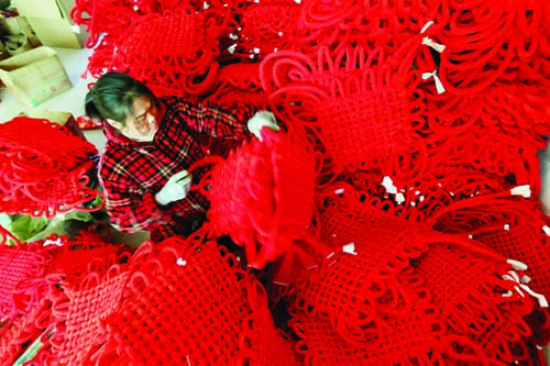 1月11日,在山東省臨沂市郯城縣紅花鎮(zhèn)一家工藝品廠,工人在整理中國結(jié)。春節(jié)臨近,山東臨沂、棗莊等地的節(jié)慶飾品車間、手工藝人開始忙碌起來,人們加緊制作各種春節(jié)飾品,供應市場。據(jù)新華社 張春雷 攝