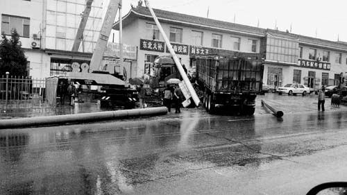 當(dāng)天夜里,五臺縣東冶鎮(zhèn)遭遇持續(xù)強(qiáng)降水天氣過程,公司調(diào)控中心值班員在凌晨3時22分發(fā)現(xiàn)10千伏829北大街線速斷掉閘,立刻電話通知所管轄區(qū)東冶供電所。得知情況后,該供電所組織搶修人員迅速趕往事故現(xiàn)場,勘查電桿及線路受損情況。經(jīng)查勘,原來是一輛重型載貨卡車在駛經(jīng)五臺縣東冶鎮(zhèn)時,因連夜大雨導(dǎo)致路面濕滑把一基電桿給撞倒了,斷裂的電桿壓在大卡車上,大卡車無法行駛。這一意外事件,造成了10千伏北大街線失電、沿線居民用電中斷。10千伏829北大街線是東冶鎮(zhèn)街道主要干線,生產(chǎn)任務(wù)繁重,能否盡快恢復(fù)送電直接關(guān)乎沿線居民的切身利益。