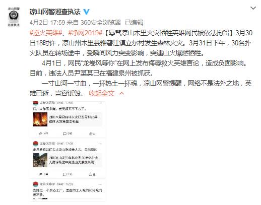 人民網(wǎng)北京4月3日電(記者孝金波 實(shí)習(xí)生張琳)3月30日18時(shí)許,涼山州木里縣雅礱江鎮(zhèn)立爾村發(fā)生森林火災(zāi),30名撲火隊(duì)員在轉(zhuǎn)場途中,突遇山火爆燃犧牲。悲痛之際,有網(wǎng)民舉報(bào)“一名叫‘龍卷風(fēng)等你’的賬戶竟在轉(zhuǎn)發(fā)撲火人員犧牲的消息時(shí)發(fā)布侮辱言論”,4月2日晚,涼山網(wǎng)警通告稱,發(fā)布侮辱言論的尹某某已在福建泉州被抓獲。