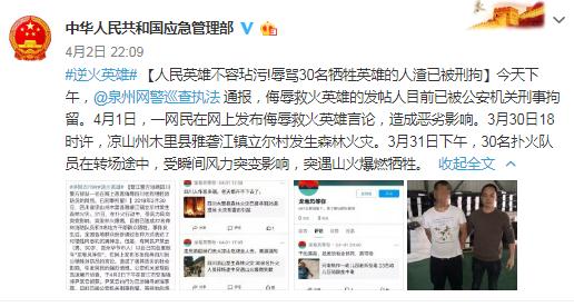 4月2日晚十時(shí)許,中華人民共和國應(yīng)急管理部通報(bào)了該事件,并稱“人民英雄不容玷污!辱罵30名犧牲英雄的人渣已被刑拘”。