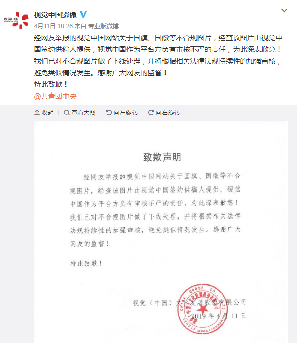 4月11日,視覺中國(guó)因黑洞照片版權(quán)問題引發(fā)公眾質(zhì)疑,共青團(tuán)中央官方微博更是直接質(zhì)問“國(guó)旗、國(guó)徽版權(quán)也是貴公司的?”直指其版權(quán)不合理售賣問題。視覺中國(guó)官方微博當(dāng)日回應(yīng),經(jīng)網(wǎng)友舉報(bào)的視覺中國(guó)網(wǎng)站關(guān)于國(guó)旗、國(guó)徽等不合規(guī)圖片,經(jīng)查該圖片由視覺中國(guó)簽約供稿人提供,視覺中國(guó)作為平臺(tái)方負(fù)有審核不嚴(yán)的責(zé)任,為此深表歉意!已對(duì)不合規(guī)圖片做了下線處理,并將根據(jù)相關(guān)法律法規(guī)持續(xù)性的加強(qiáng)審核,避免類似情況發(fā)生。