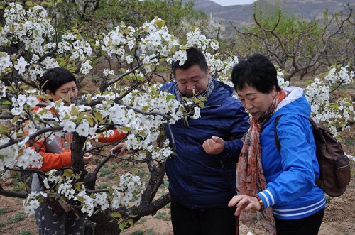 圖一 梨花盛開 我心燦爛 西呼延村梨花園清新宜人 圖右為石潤所