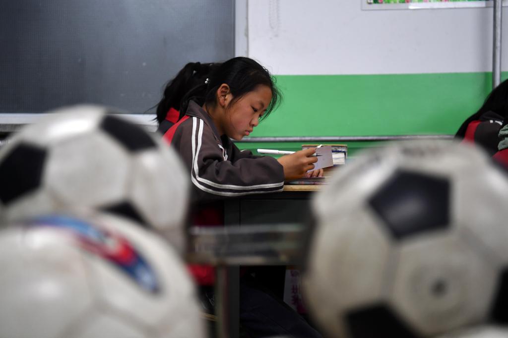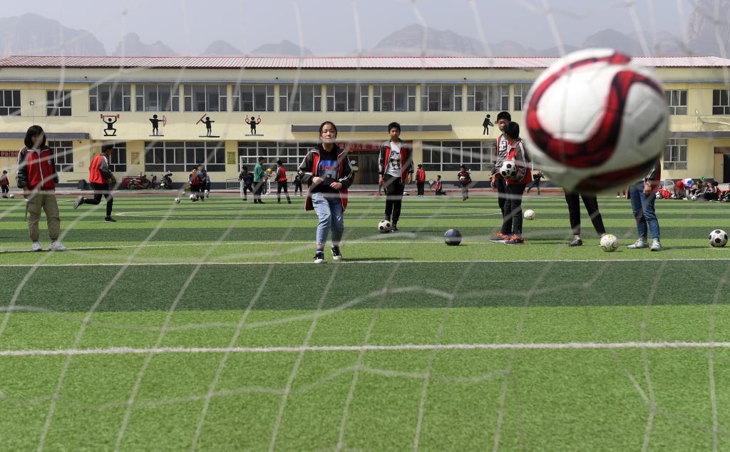 ↑這是學(xué)生們?cè)隗w育課上進(jìn)行射門(mén)訓(xùn)練(4月18日攝)。新華社記者李俊東攝