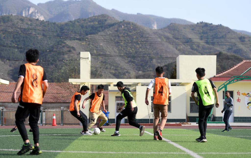 ↑這是初中組男子足球隊(duì)隊(duì)員在進(jìn)行分組對(duì)抗賽(4月17日攝)。新華社記者李俊東攝