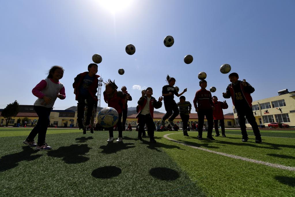 ↑這是學(xué)生們?cè)谇驁?chǎng)上訓(xùn)練(4月16日攝)。新華社記者詹彥攝