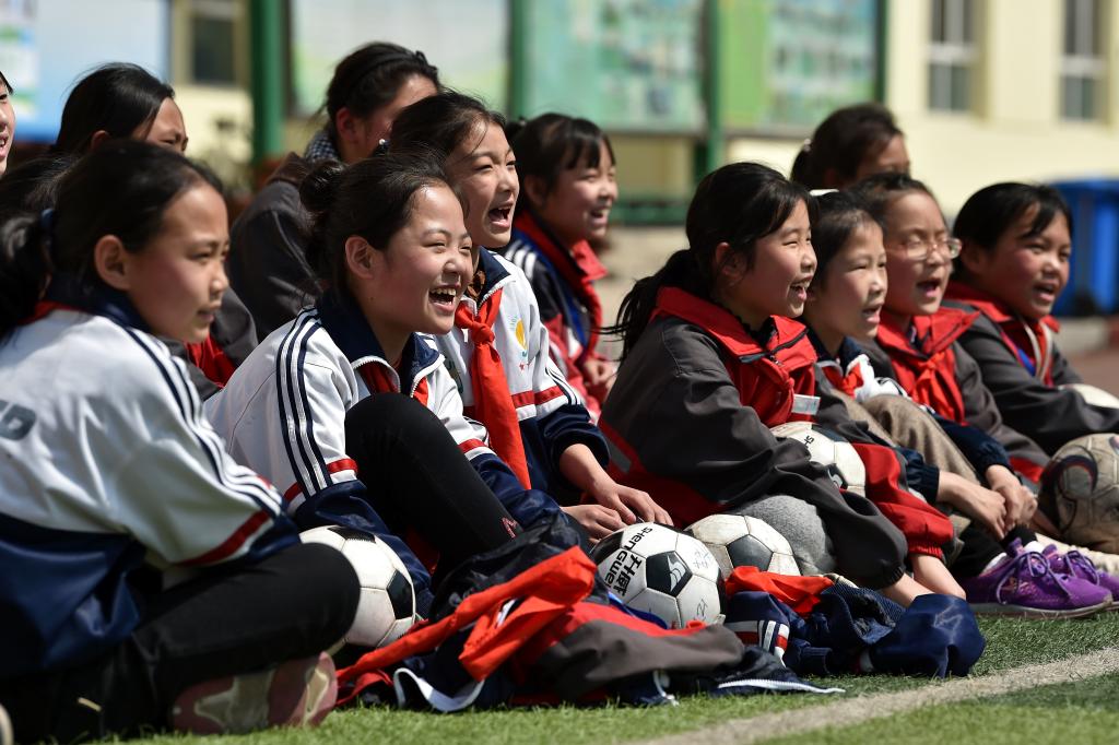 ↑這是初一119班的足球隊(duì)隊(duì)員在球場(chǎng)上合影(4月16日攝)。新華社記者詹彥攝