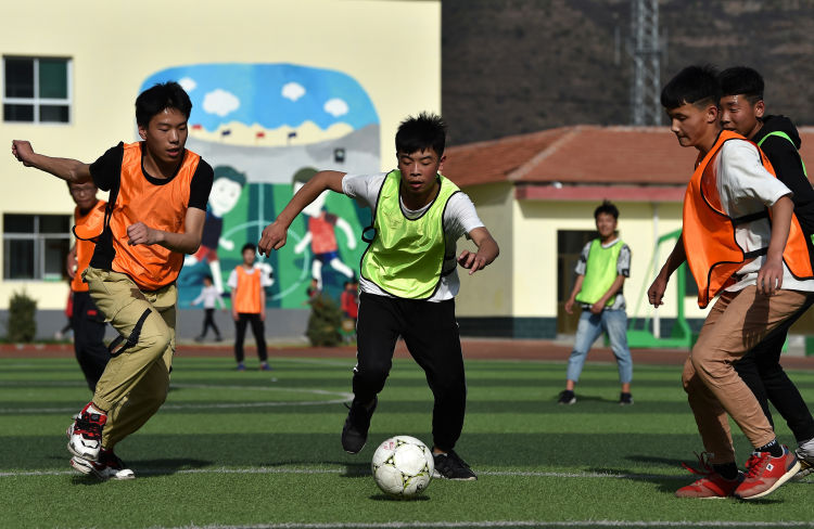 ↑這是初中組男子足球隊隊員在進行分組對抗賽(4月17日攝)。新華社記者詹彥攝