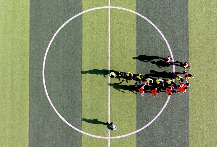 ↑這是初中組男子足球隊隊員在分組對抗賽開始前互相擊掌(4月17日無人機拍攝)。新華社記者詹彥攝