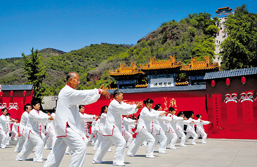 5月5日,北京平谷區(qū)劉家店鎮(zhèn)舉辦丫髻山第三十屆休閑文化廟會(huì),開(kāi)展威風(fēng)鑼鼓、秧歌花會(huì)、百人太極等表演活動(dòng)和書法雅集、文創(chuàng)展示等文化活動(dòng),吸引大批來(lái)自京津冀地區(qū)的游人參加。圖為劉家店鎮(zhèn)的老年人在文化廟會(huì)上表演太極拳。新華社記者 李欣 攝