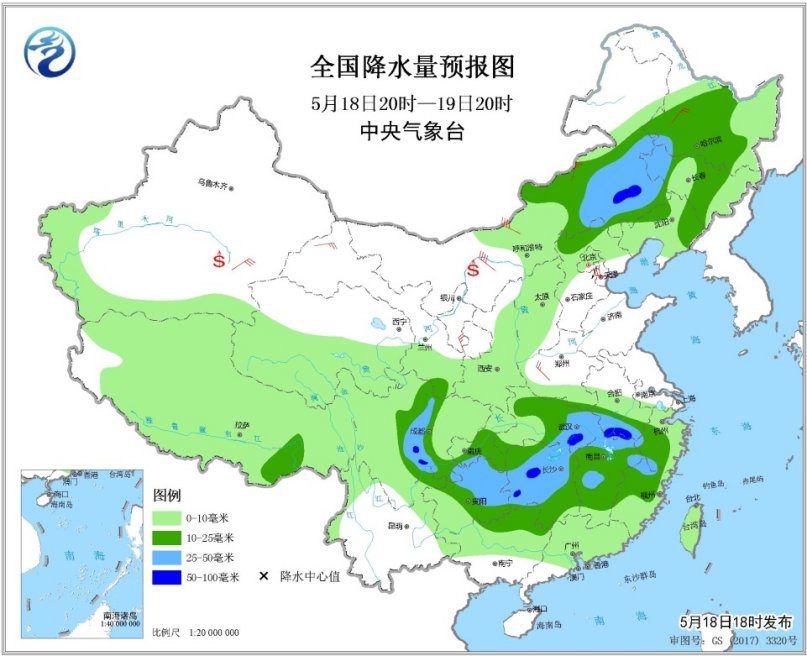5月18日20時至19日20時,內(nèi)蒙古中東部、東北地區(qū)中部、四川盆地西部、西南地區(qū)東部、江漢、江南等地的部分地區(qū)有中到大雨,其中內(nèi)蒙古東南部、四川盆地西南部、湖南北部、湖北南部、安徽南部等地局地有暴雨(50~80毫米),上述部分地區(qū)有短時強(qiáng)降水,局部并伴有雷暴大風(fēng)等強(qiáng)對流天氣。西北地區(qū)中東部、內(nèi)蒙古大部、華北、東北等地的部分地區(qū)有5~7級風(fēng),局地陣風(fēng)8~9級。內(nèi)蒙古西部、南疆盆地等地有揚(yáng)沙或浮塵天氣。