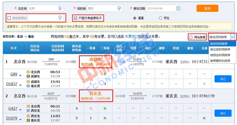 2、換乘過程中,存在同站換乘和不同車站換乘兩種情況。在列車余票信息頁面,旅客可根據(jù)需求,對(duì)“指定換乘站”“只顯示有座席車次”“同站換乘”等信息進(jìn)行勾選。此外,車票信息還可以根據(jù)總歷時(shí)、出發(fā)、到達(dá)、停留時(shí)間進(jìn)行排序。