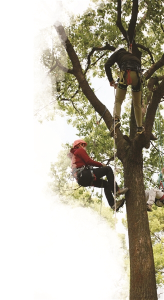 4月26日,蘇州市盤門景區(qū)里的一幕吸引了不少游客。景區(qū)香樟林里的一片區(qū)域,被隔離帶隔開,里面有兩棵比較粗壯的香樟樹,樹干上垂著多條繩索。12名全副武裝的學(xué)員,戴著安全頭盔、系著安全繩、穿著安全靴,在總教練的指導(dǎo)下,握著繩索開始往樹上攀爬。