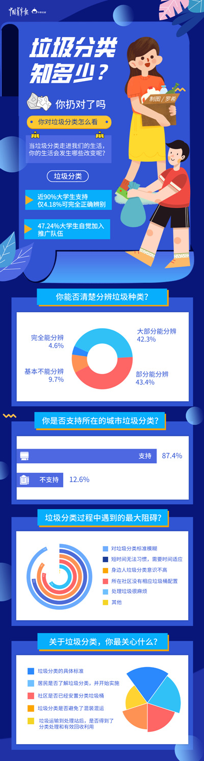 近日,中青校媒面向全國900名大學(xué)生發(fā)起問卷調(diào)查。調(diào)查結(jié)果顯示,87.4%的大學(xué)生支持垃圾分類,希望所在城市實施垃圾分類措施。