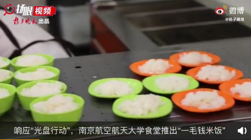 南京航空航天大學(xué)食堂則推出了“一毛錢米飯”。食堂有售價6毛、4毛、1毛的不同分量米飯,50克的米飯僅需一毛錢。