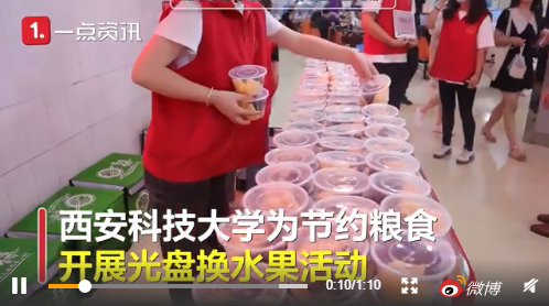 西安科技大學(xué)為節(jié)約糧食開展了光盤換水果的活動,學(xué)生們只要把飯菜吃完清盤,就可以換到一份飯后果盤和代金券。校方介紹,他們每餐準備了500份水果,該活動推出之后,收餐量減少了40%到50%。
