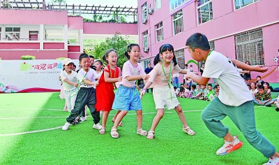 浙江仙居縣第一小學(xué)內(nèi),一年級新生們正在玩老鷹捉小雞游戲。王華斌攝/光明圖片