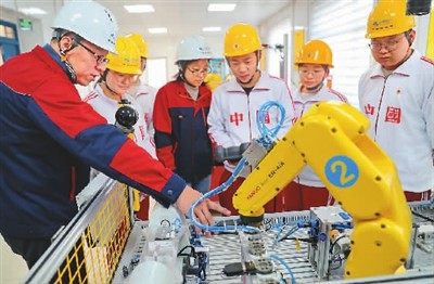 河北建材職業(yè)技術(shù)學(xué)院教師指導(dǎo)學(xué)生進(jìn)行工業(yè)機(jī)器人操作與運(yùn)維1+X職業(yè)等級(jí)證書的實(shí)操訓(xùn)練。(曹建雄攝 人民視覺)