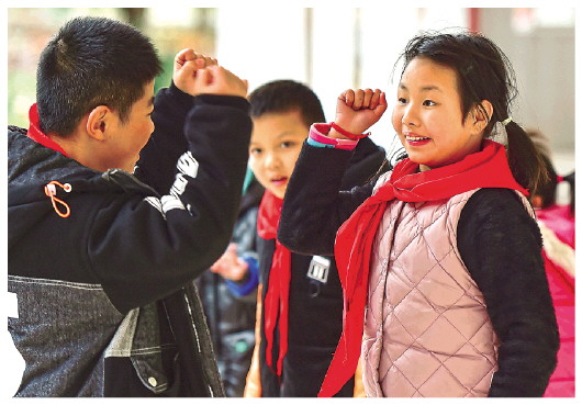 課間操,聽(tīng)障學(xué)生在玩耍打鬧(2月23日攝)。本報(bào)記者魏培全攝